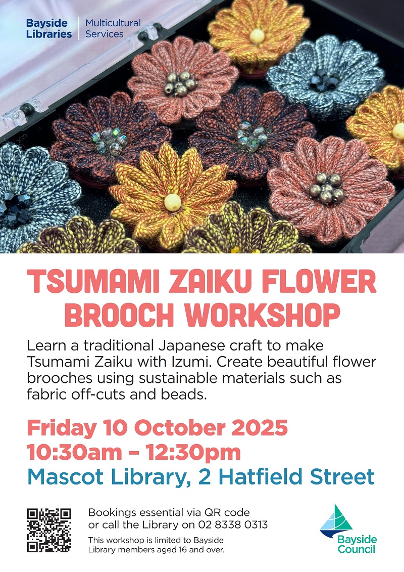 时间: 2025年10月10日星期五 早上十点半至中午十二点半 地点: Mascot Library, 2 Hatfield Street 本工作坊仅限Bayside图书馆16岁以上会员参加 必需在线预约或扫描海报二维码, 预约网址 https://baysidelibrary.eventbrite.com 电话查询: Bayside图书馆多元文化服务 02 8338 0313 或者电邮: enquiry@bayside.nsw.gov.au 图书馆网站: library.bayside.nsw.gov.au 中文图书电子目录:https://bayside-chit.ibims.com.au