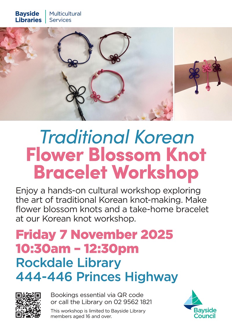 时间: 每月第二个星期五 早上十点半至中午十二点半 地点: 请留意海报上列明每次活动的举办地点 每次活动开始前两周上午 10:30 开放线上预约。文化手工艺工作坊仅限 Bayside 图书馆会员参加 必需在线预约或扫描海报二维码, 预约网址 https://baysidelibrary.eventbrite.com 需要帮助和咨询, 请致电图书馆,电话 02 9562 1821