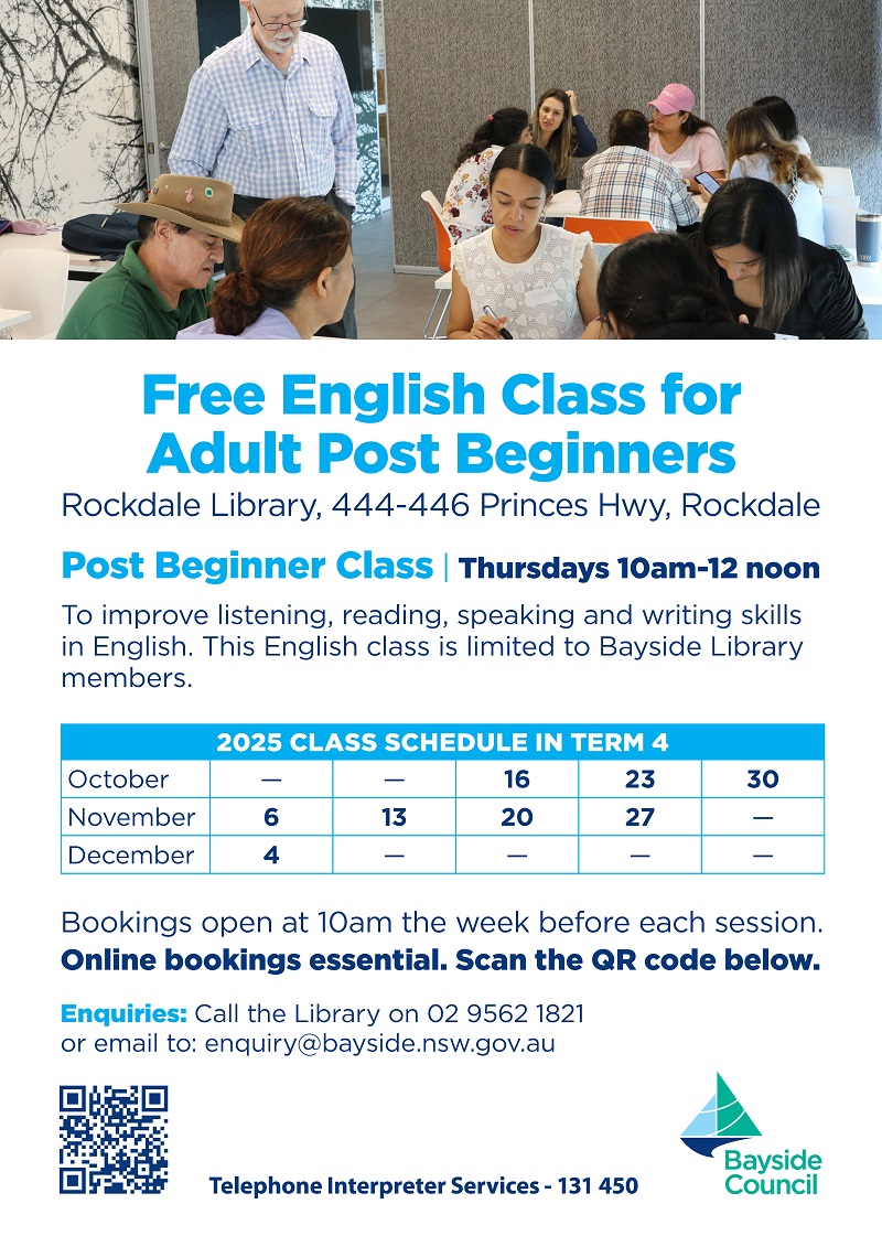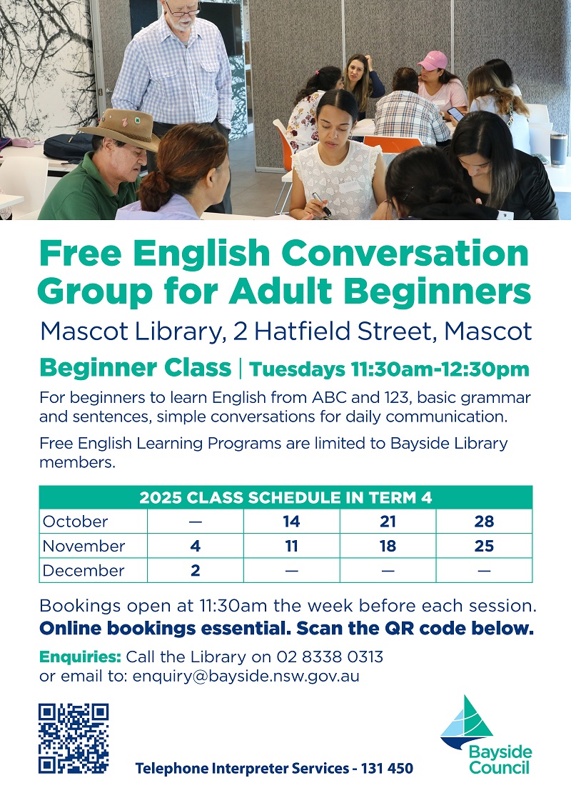 1) 英语初级班上课时间(BEGINNERS): 星期二上午11点半至中午12点半 地址:Mascot Library, 2 Hatfield Street, Mascot 每次上课前一周上午 11 点 30分开放预约,必需在线预约或扫描海报二维码,预约网址 https://baysidelibrary.eventbrite.com 需要帮助和咨询, 请致电图书馆,电话 02 8338 0313 或者电邮: enquiry@bayside.nsw.gov.au 电话传译服务 - 131 450 2) 英语进阶班上课时间(POST BEGINNERS): 星期四上午10点至中午12点 地址:乐调图书馆, Rockdale Library, 444-446 Princes Highway, Rockdale 每次上课前一周上午 10 点开放预约,必需在线预约或扫描海报二维码,预约网址 https://baysidelibrary.eventbrite.com 需要帮助和咨询, 请致电图书馆,电话 02 9562 1821 或者电邮: enquiry@bayside.nsw.gov.au 电话传译服务 - 131 450
